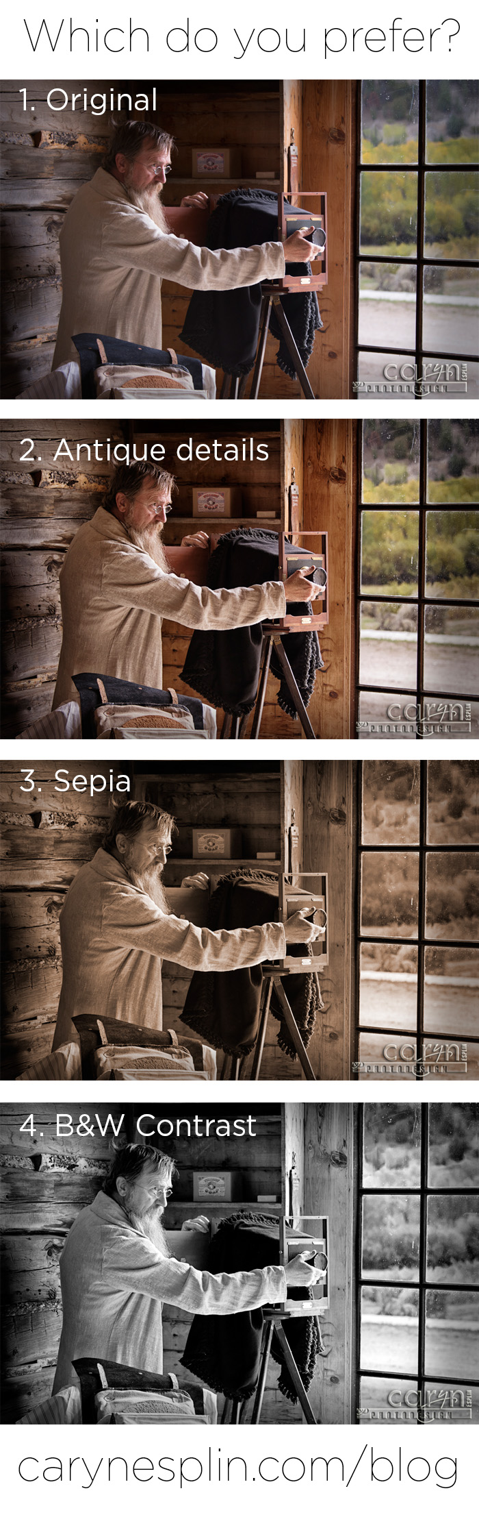 I had a blast photographing the Living History Weekend at Bananck Ghost Town last week, so now I want to post some of my favorite images. However I need help deciding which style to go for.