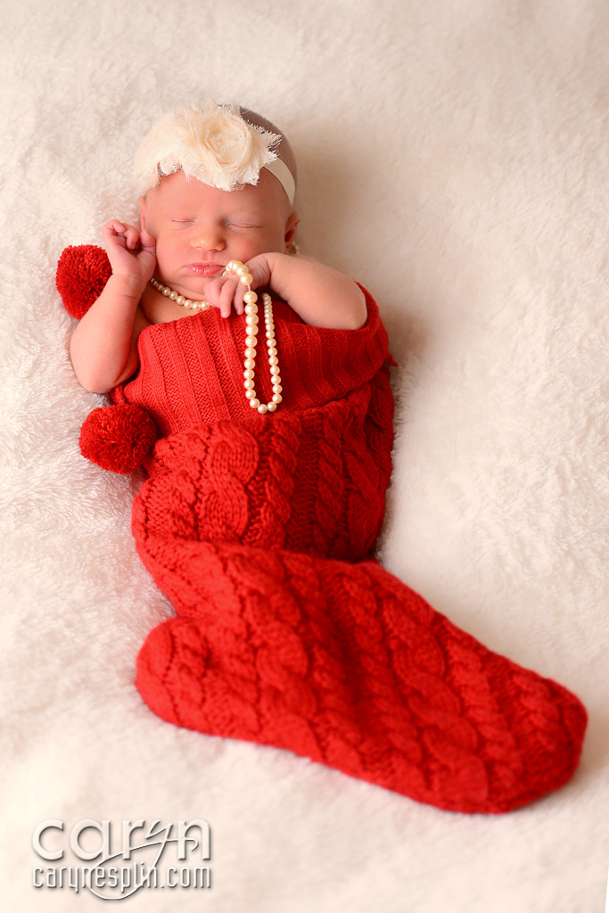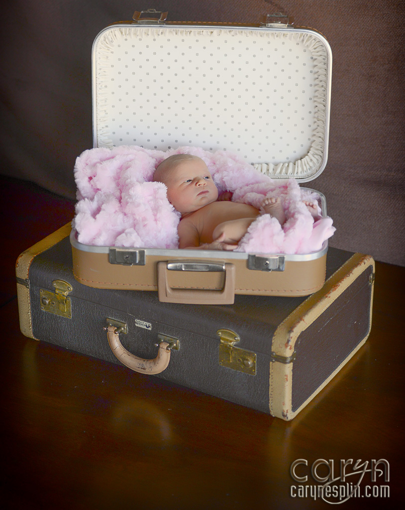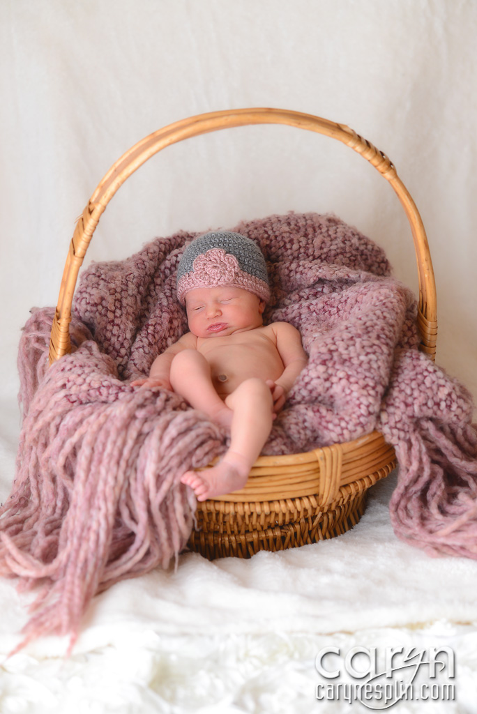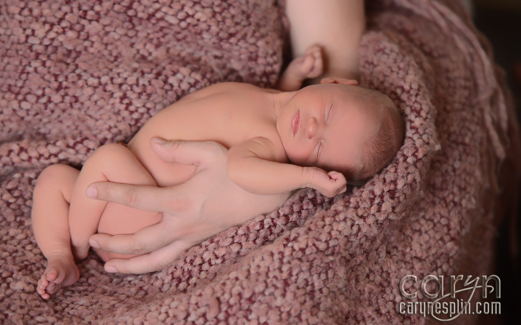 I have a south facing room with a bed next to a large window. I put a sheet on that window, since it was a sunny day. So that made a giant softbox of natural light. Then we closed the door and cranked the heat up to keep her comfortable. I didn’t even have to get out my big continuous studio lights. That was nice, since I thought we might have to use those. I would love to hear what you think of this newborn photo session.