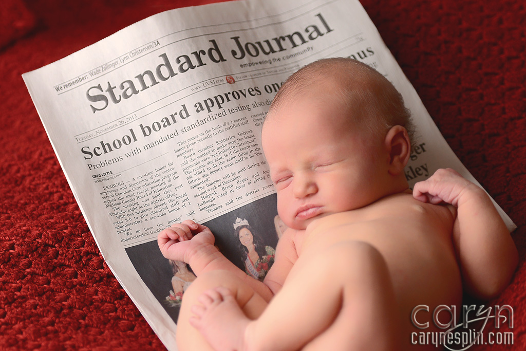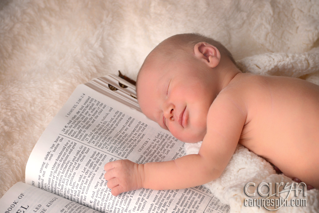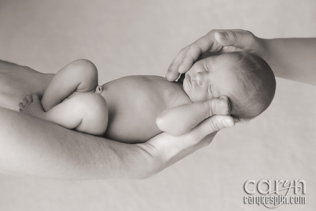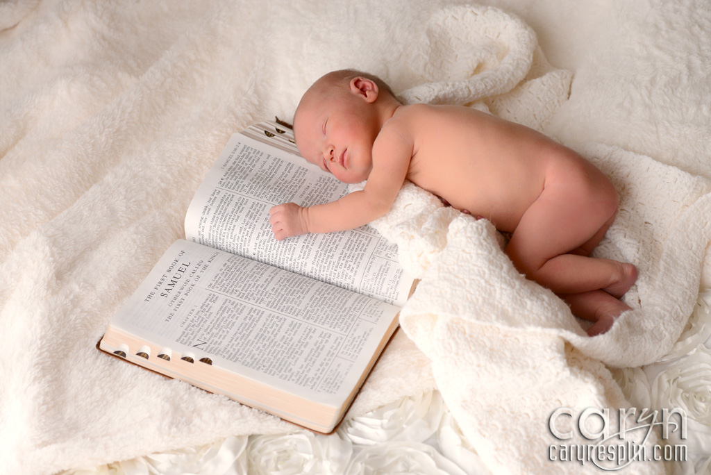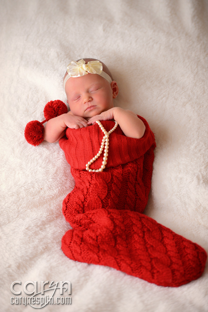 I have a south facing room with a bed next to a large window. I put a sheet on that window, since it was a sunny day. So that made a giant softbox of natural light. Then we closed the door and cranked the heat up to keep her comfortable. I didn’t even have to get out my big continuous studio lights. That was nice, since I thought we might have to use those. I would love to hear what you think of this newborn photo session.