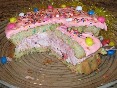 1. Bake the cake in a Baker’s Secret Tiara Dessert pan. I found one at Walmart a few years ago. It has a nice indented hollow space for fillings and works well for an ice cream cake. It also has a pretty fluted edge, which is fun to leave unfrosted and show off. Since I only have one of these pans, I baked half the batter first, then put it on a cooling rack, and baked the other half. Oh, and be sure you spray the pan and flour it lightly to make it easier to remove the cake. I baked it according to the time and temperature for a round cake.